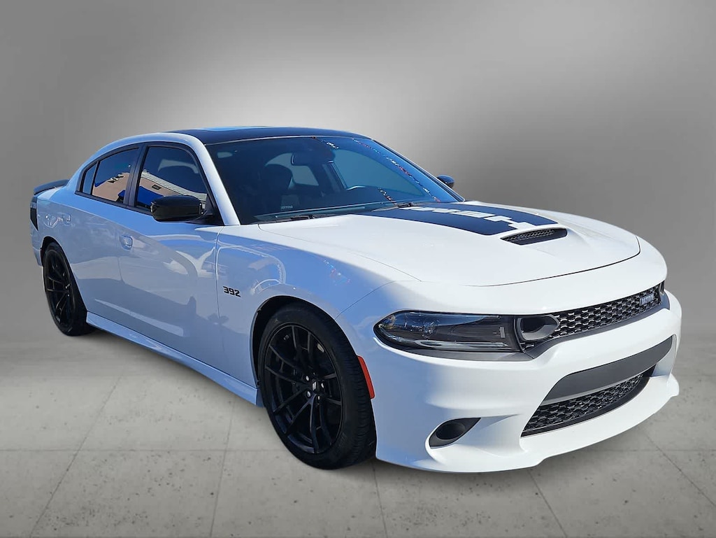 Our aggressive One Owner, Accident Free 2023 Dodge Charger Scat Pack Sedan Daytona Edition is waiting for you at the starting line in White Knuckle! Powered by a 6.4 Liter 392 HEMI V8 generating 485hp to an 8 Speed Automatic transmission for a roaring soundtrack and remarkable thrills. This Rear Wheel Drive sedan also has a high-performance suspension with Brembo brakes and a limited-slip rear differential for athletic handling, and it returns nearly 24mpg on the highway. Just prepare for stares since our Charger shows off LED lighting, a functional hood scoop, a performance grille, a black rear spoiler, a sunroof, active exhaust with dual outlets, and Daytona upgrades like 20-inch black wheels, bold badging, and a Mopar cold-air intake.