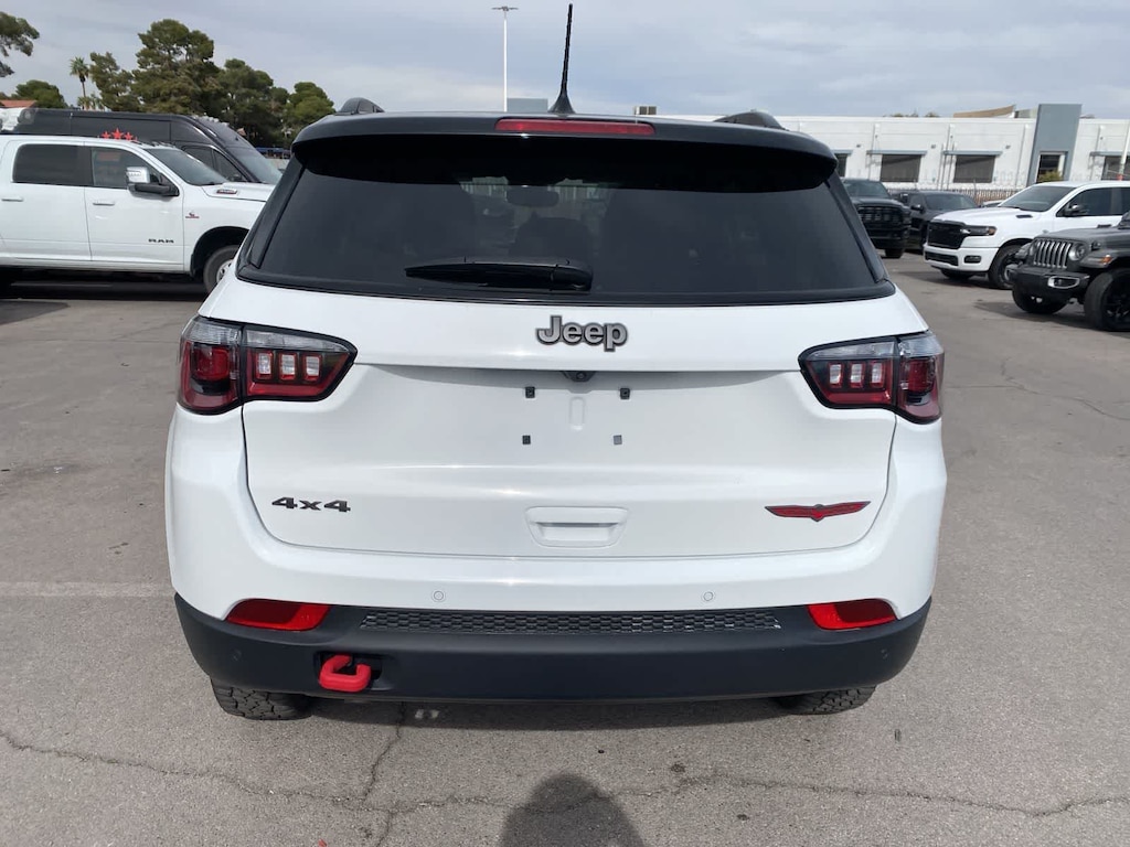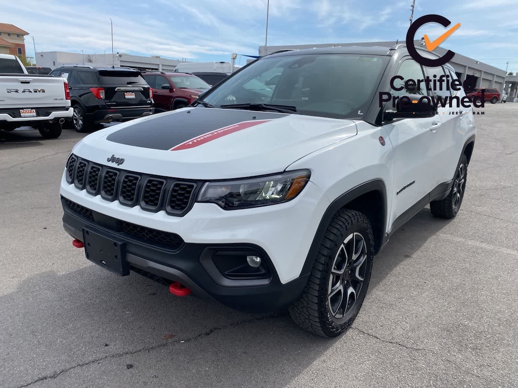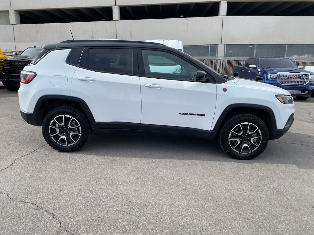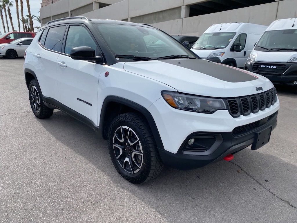 Born to push boundaries, our One Owner 2025 Jeep Compass Trailhawk 4X4 commands respect in Bright White! Powered by a TurboCharged 2.0 Liter 4 Cylinder providing 200hp to an 8 Speed Automatic transmission protected by a robust skid plate. This Four Wheel Drive SUV also has an off-road suspension with a terrain management system to handle adventure where you find it, and it achieves nearly 32mpg on the highway. Modern Jeep style comes into the picture with LED lighting, a black roof, a black hood decal, roof rails, black alloy wheels, tow hooks, and more skid plates for additional underbody protection.