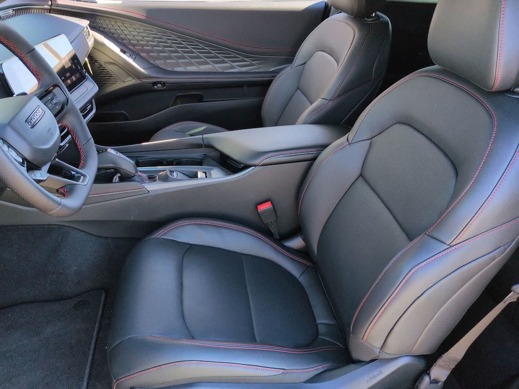 The Scat Pack cabin is arranged around the driver with heated cloth sport front seats, eight-way power for the driver, a heated leather steering wheel, dual-zone automatic climate control, bright pedals, keyless entry with push-button start, and remote start. Technology highlights include an 8.4-inch touchscreen with voice recognition, Android Auto, Apple CarPlay, Bluetooth, available WiFi compatibility with a required subscription, and an Alpine audio system.