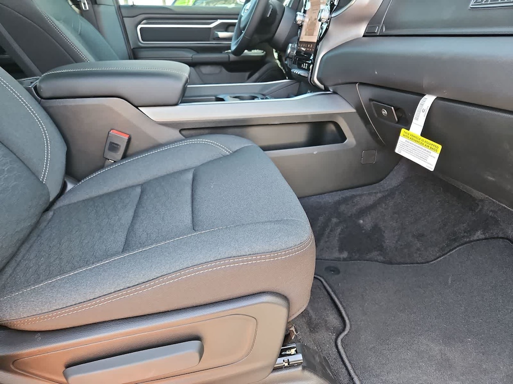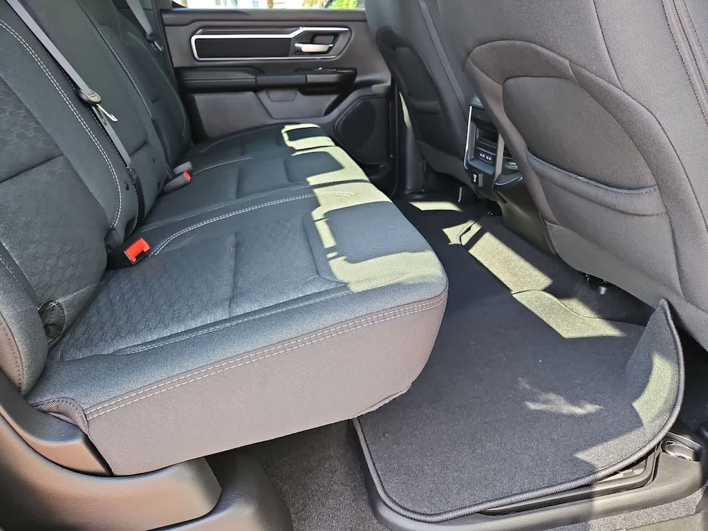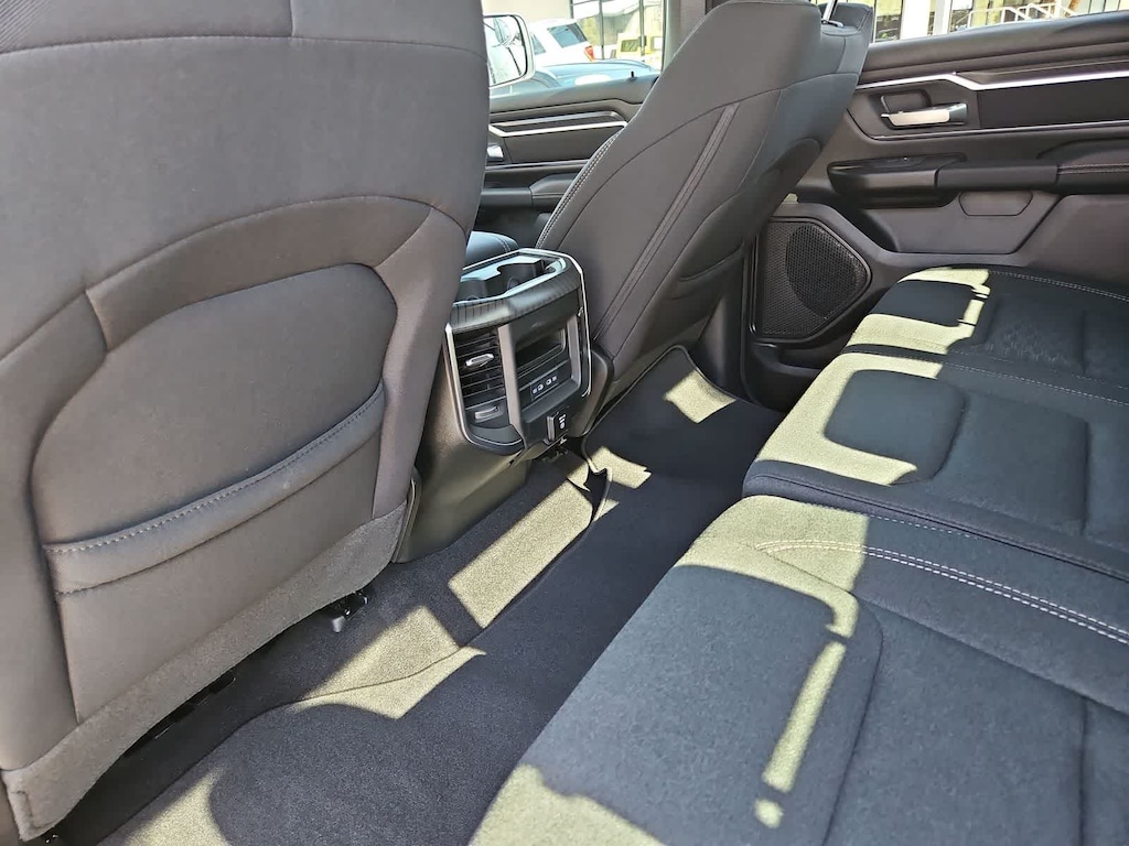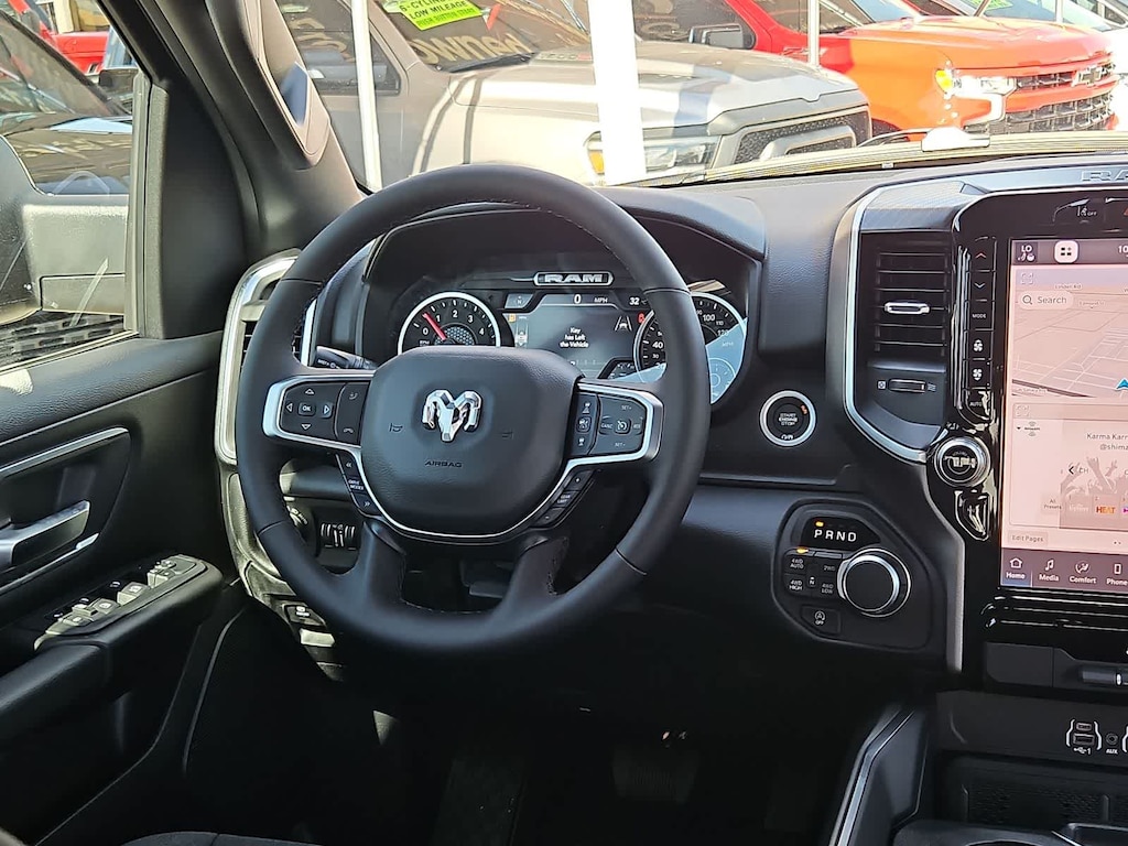 Our Big Horn cabin has been tailored to fit your needs, with the Level 2 Equipment Packages heated deluxe cloth seats, a heated leather-wrapped steering wheel, universal home remote, power adjustable pedals, power sliding rear window, dual climate control, a RAM Clean-Air System, keyless access, push-button ignition, cruise control, door-sill scuff plates, and clever cargo space, and a Uconnect 5 with 12.0-inch touchscreen features voice control, Bluetooth, and a nine-speaker sound system for intelligent infotainment.