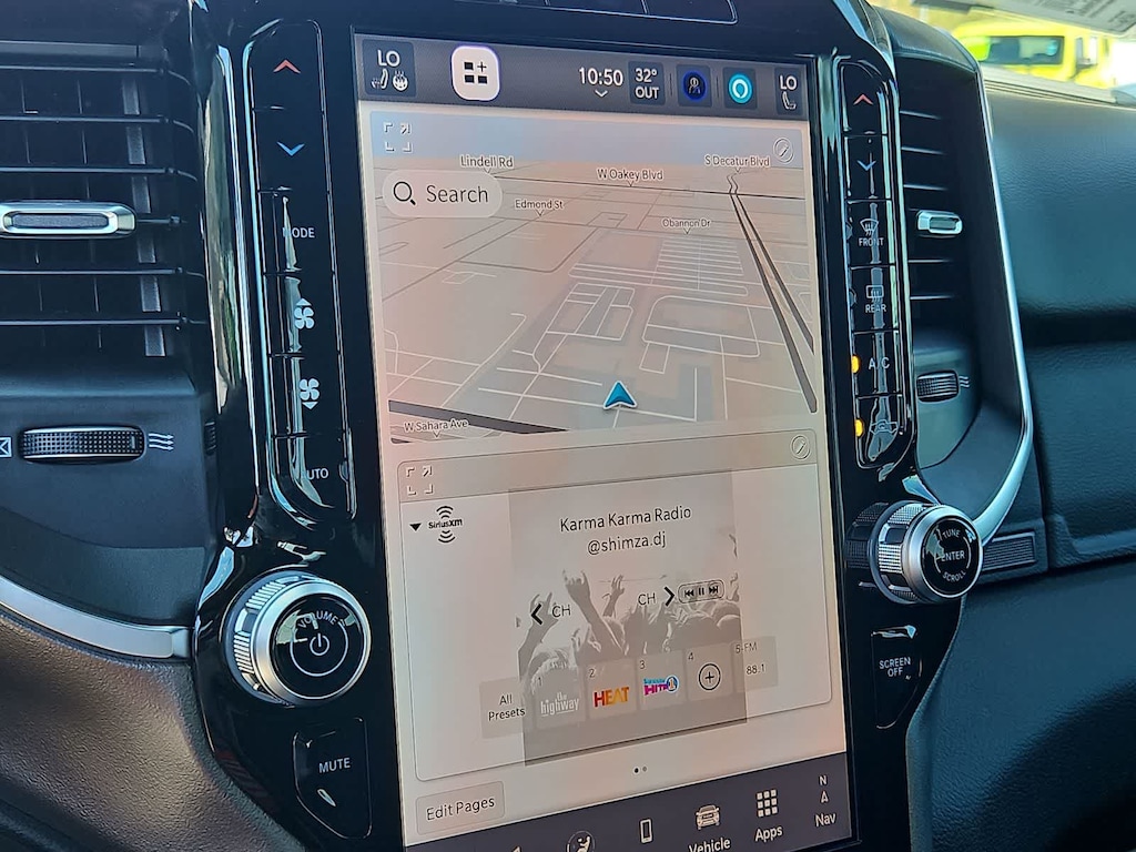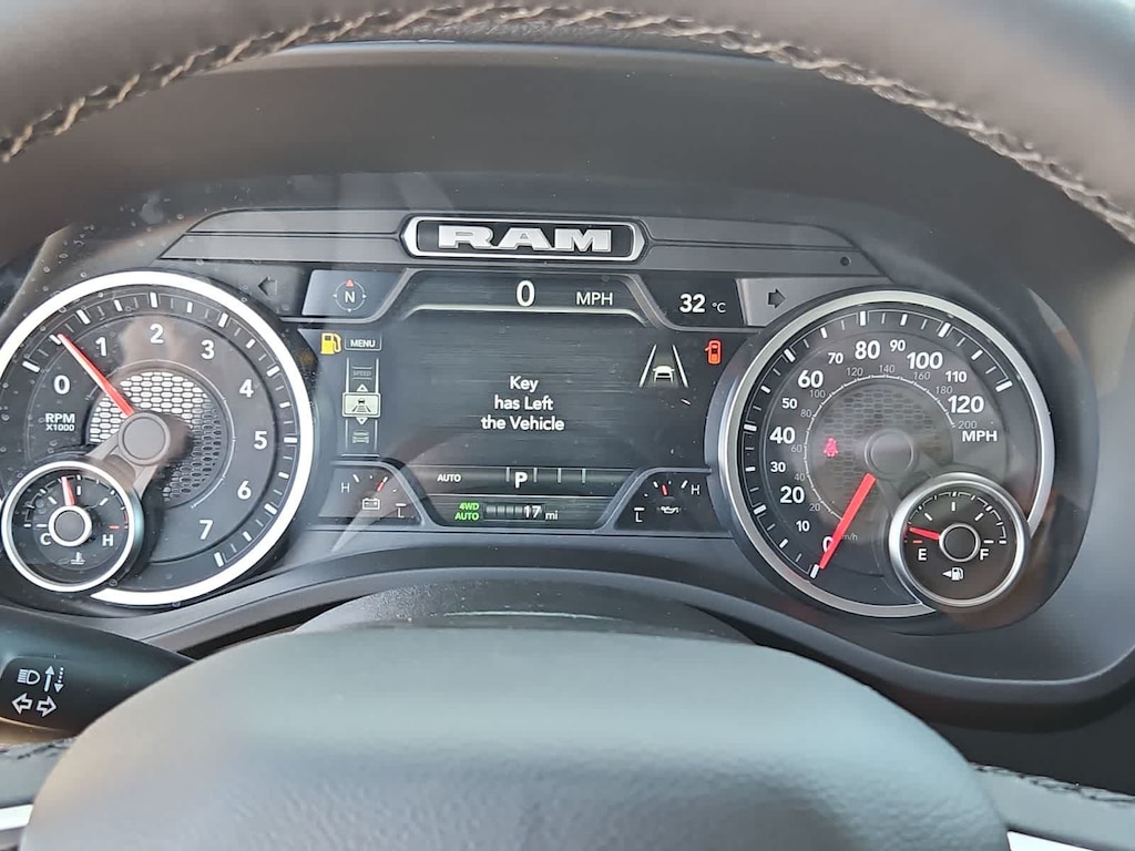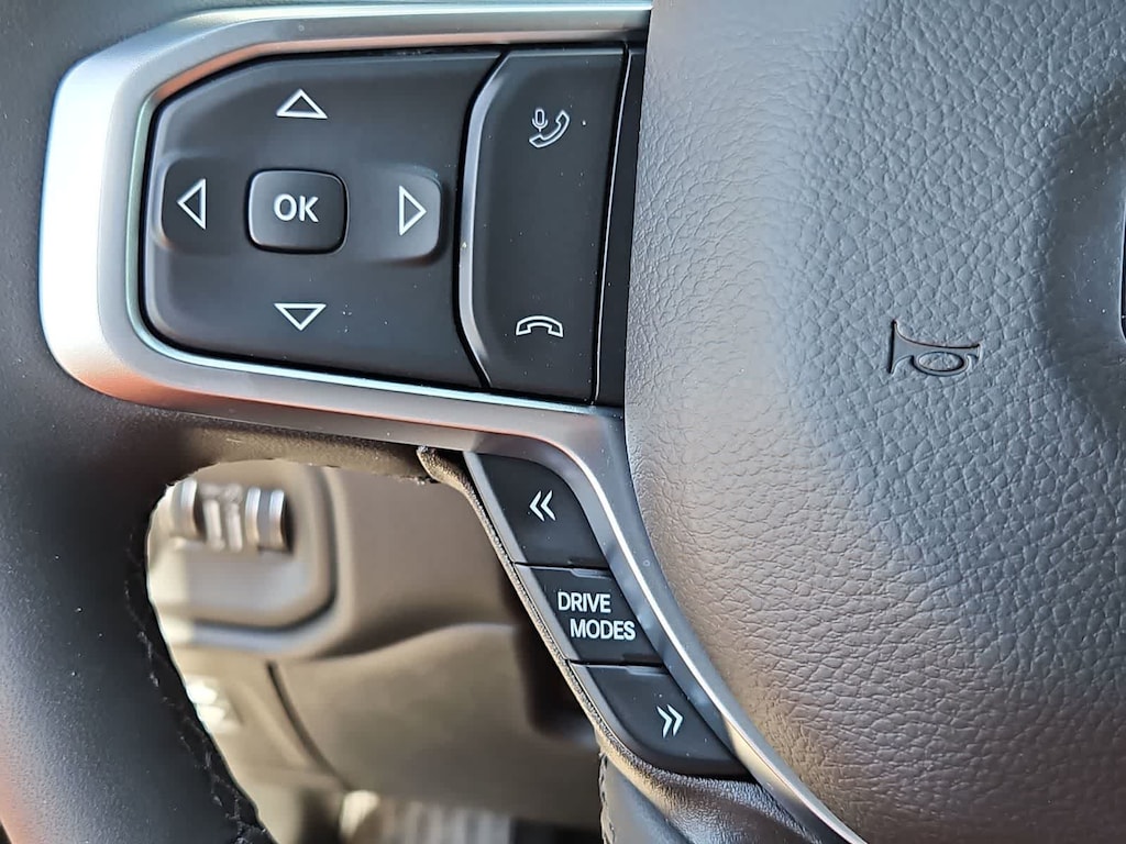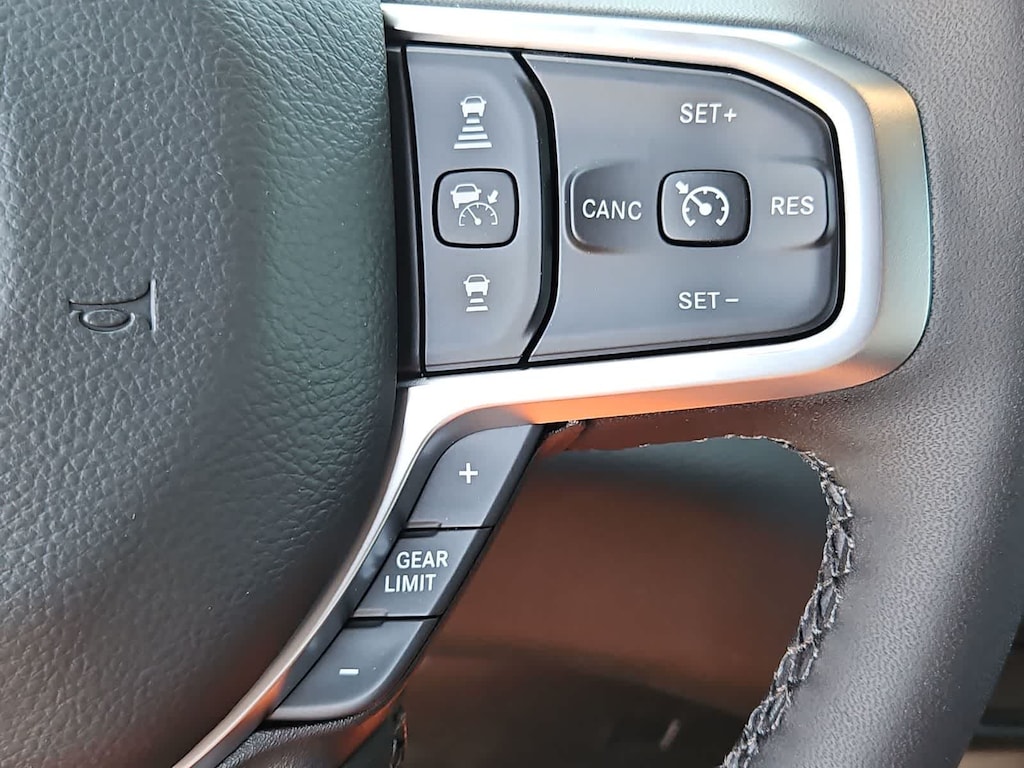Our Big Horn cabin has been tailored to fit your needs, with the Level 2 Equipment Packages heated deluxe cloth seats, a heated leather-wrapped steering wheel, universal home remote, power adjustable pedals, power sliding rear window, dual climate control, a RAM Clean-Air System, keyless access, push-button ignition, cruise control, door-sill scuff plates, and clever cargo space, and a Uconnect 5 with 12.0-inch touchscreen features voice control, Bluetooth, and a nine-speaker sound system for intelligent infotainment.