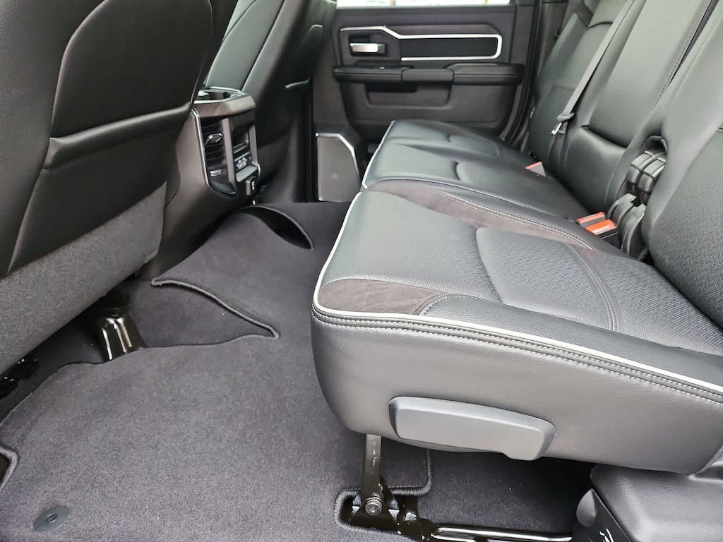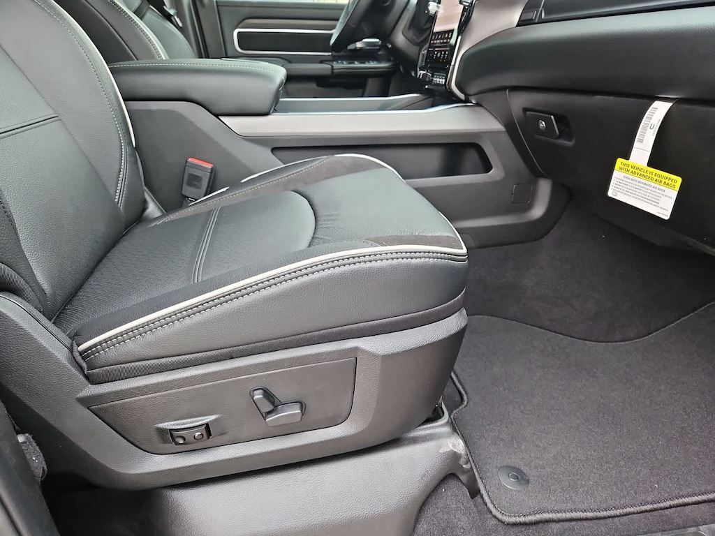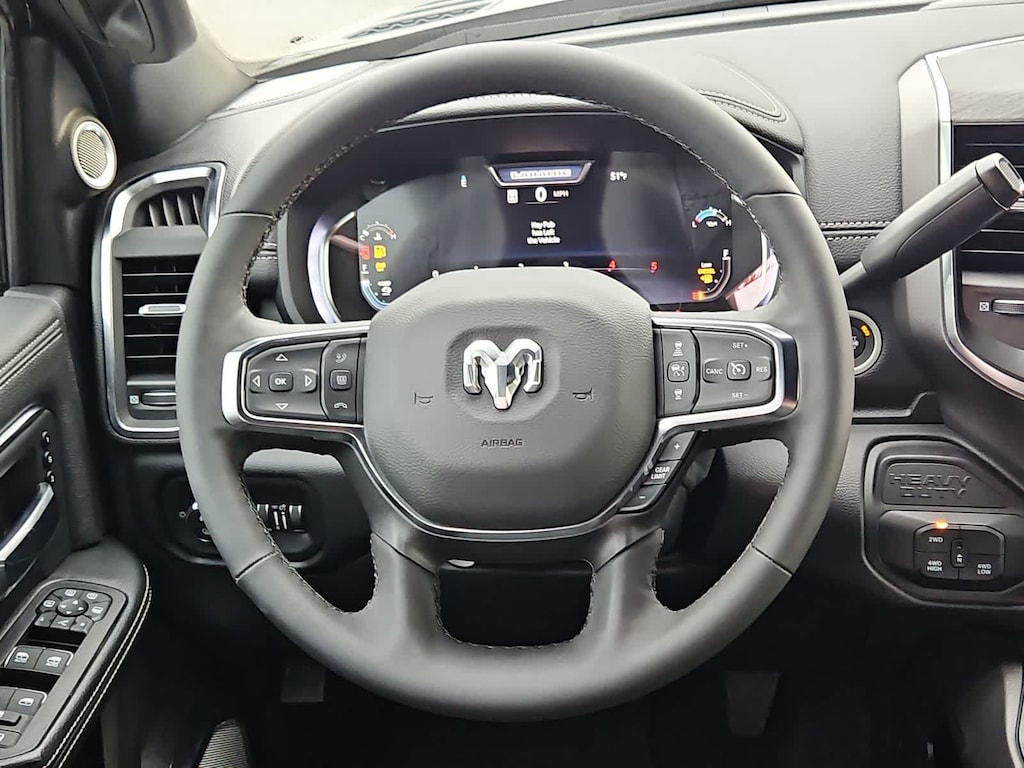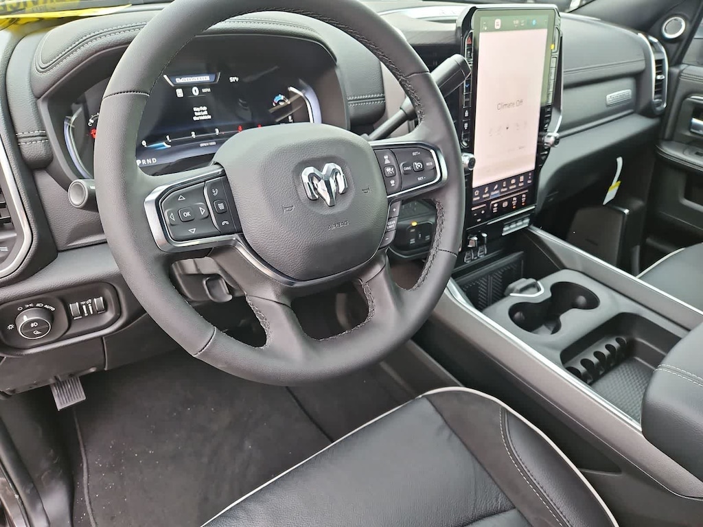 Our Laramie cabin offers a commanding experience in comfort, thanks to the Level 2 Plus Equipment Packs dual wireless charging, heated and ventilated leather power front seats, a leather-wrapped steering wheel, dual-zone automatic climate control, an interior 115V/400W outlet, keyless access and ignition, power-adjustable pedals with memory, a power sliding rear window, and remote start. Full-color navigation helps you find your way while staying connected with a 14.4-inch touchscreen, Wi-Fi, Amazon Alexa, Android Auto, Apple CarPlay, Bluetooth, voice control, and 17-speaker Harman Kardon audio.