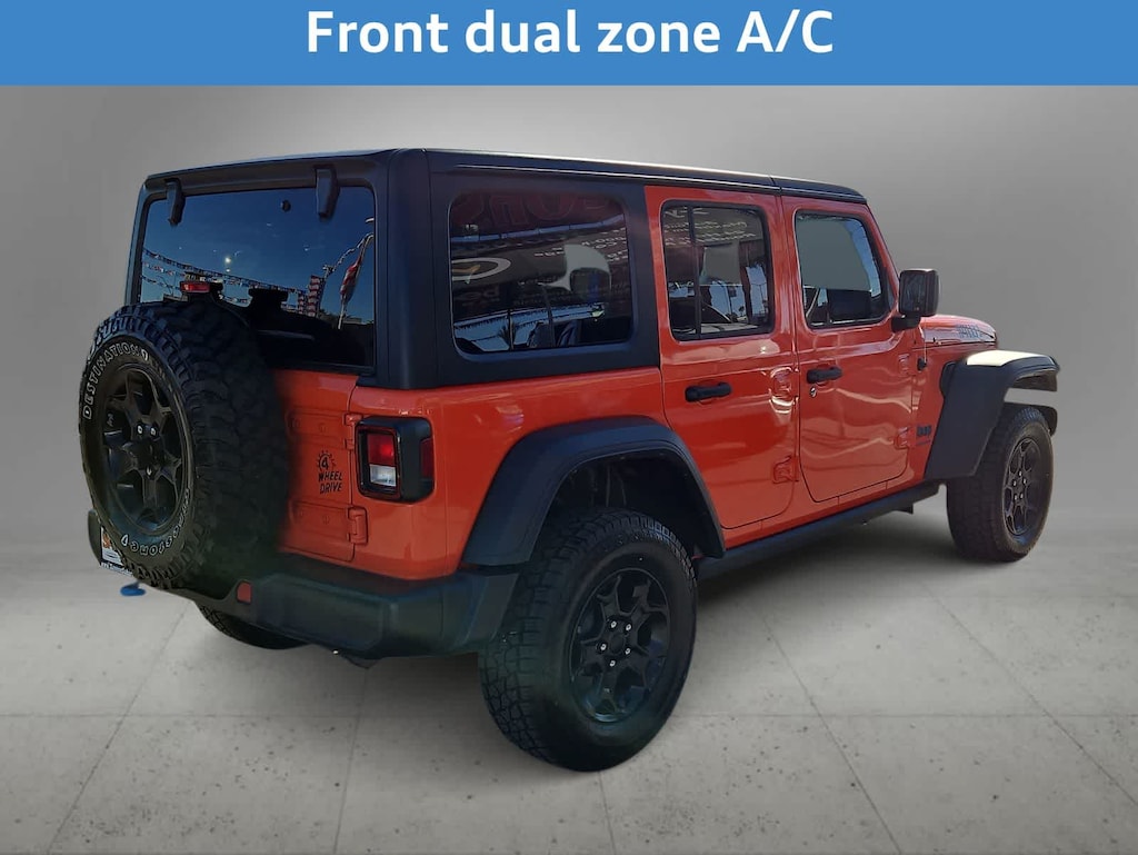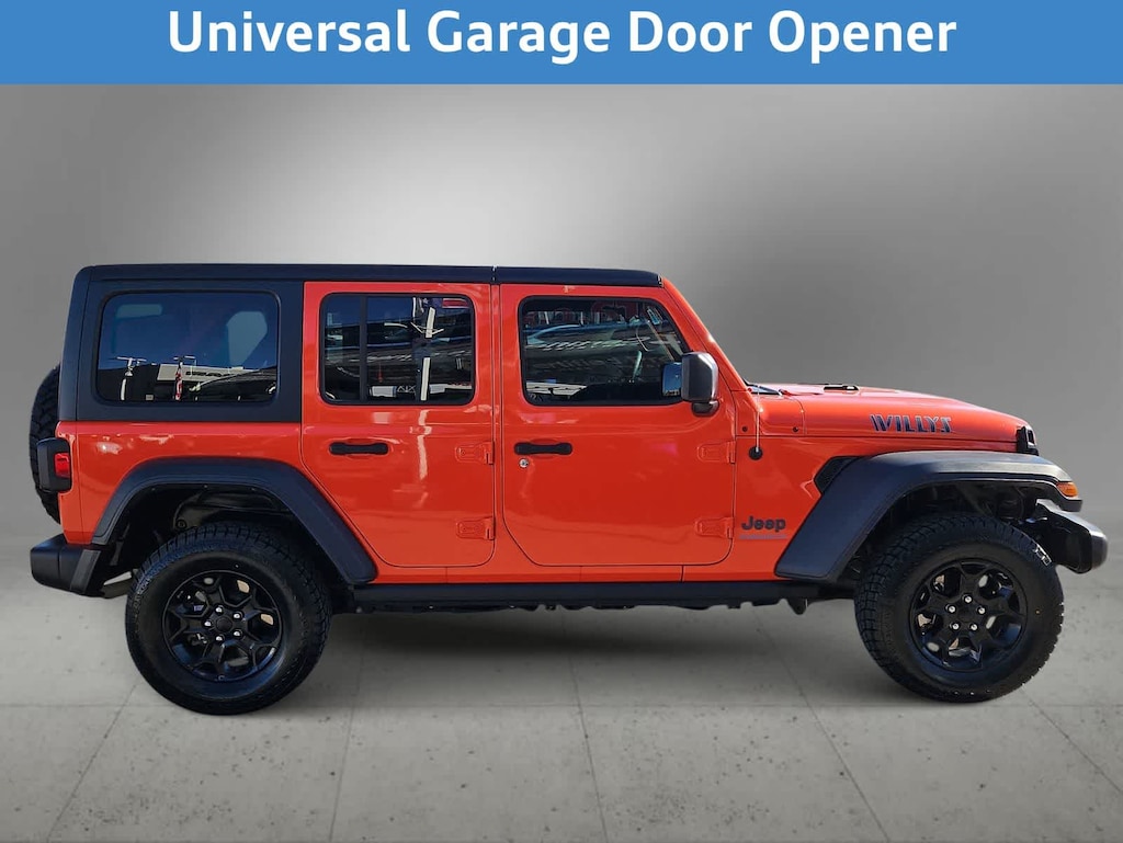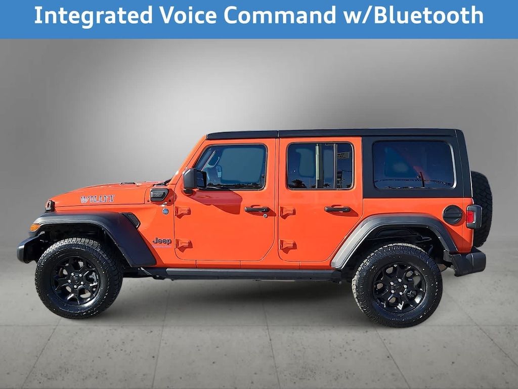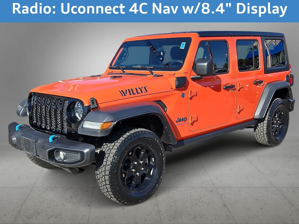 CARFAX One-Owner. Punkn Metallic Clearcoat 2023 Jeep Wrangler Base 4xe 4WD 8-Speed Automatic 2.0L I4 DOHC 2.0L I4 DOHC, 4xe 4-Wheel Drive Swing Gate Decal, 9 Speakers, 97 MPH Vehicle Max Speed Calibration, Anti-Spin Differential Rear Axle, Apple CarPlay/Android Auto, Black 3-Piece Hard Top, Black Grille, Convenience Group, Electronic Stability Control, Freedom Panel Storage Bag, Front Bucket Seats, Front dual zone A/C, Front LED Fog Lamps, Fully automatic headlights, Heated door mirrors, Integrated Voice Command w/Bluetooth, LED Headlamp & Fog Lamp Group, LED Premium Reflector Headlamps, Molded-In-Color Fender Flares (2-Piece), Normal Duty Suspension, ParkView Rear Back-Up Camera, Quick Order Package 29W Willys, Radio: Uconnect 4C Nav w/8.4 Display, Rear Window Defroster, Rear Window Wiper/Washer, Telescoping steering wheel, Universal Garage Door Opener, Wheels: 17 x 7.5 Black Aluminum, Willys, Willys 4xe Hood Decal.