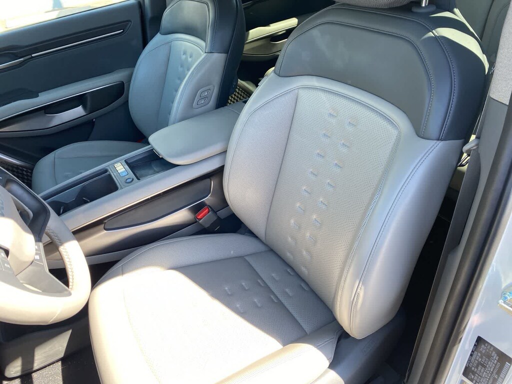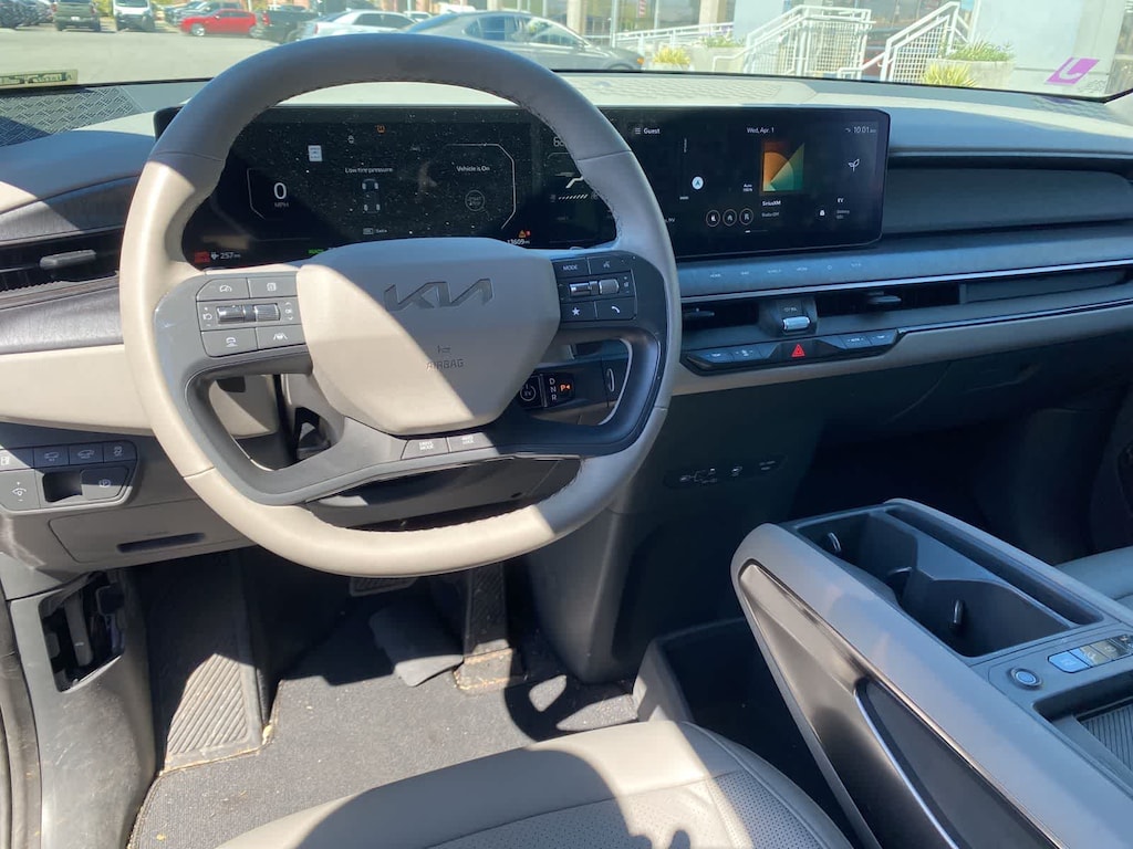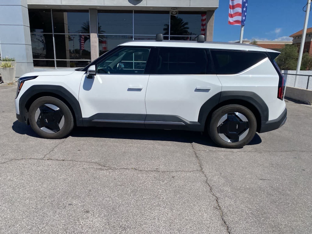 Our sophisticated One Owner, Accident Free 2024 Kia EV9 Wind in Snow White Pearl makes electric driving a breeze! Motivated by Dual Electric Motors providing a combined 379hp to a Single Speed Automatic transmission for quick and capable performance. This All Wheel Drive SUV also boasts a 99.8kWh battery pack, enabling nearly 280 miles of range on a single charge. Charged-up styling is displayed with our EV9s dual sunroofs, hands-free liftgate, LED lighting, low-profile roof rails, auto-extending door handles, matte-black body cladding, and 19-inch black alloy wheels.
